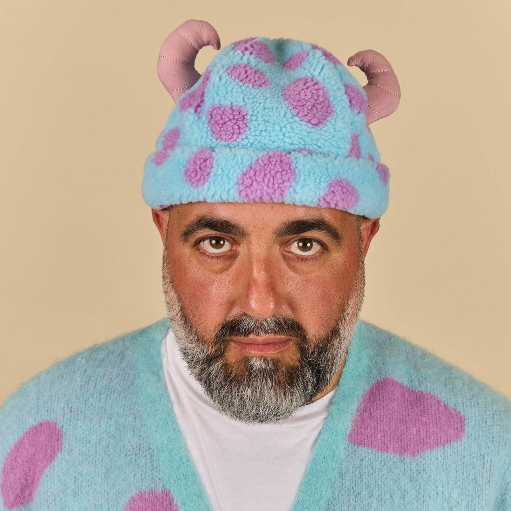 Inspired by everyone’s favorite top scarer, our Pixar’s Sulley Sherpa Beanie pays homage to James P. Sullivan with his iconic blue fur, purple spots and horns!