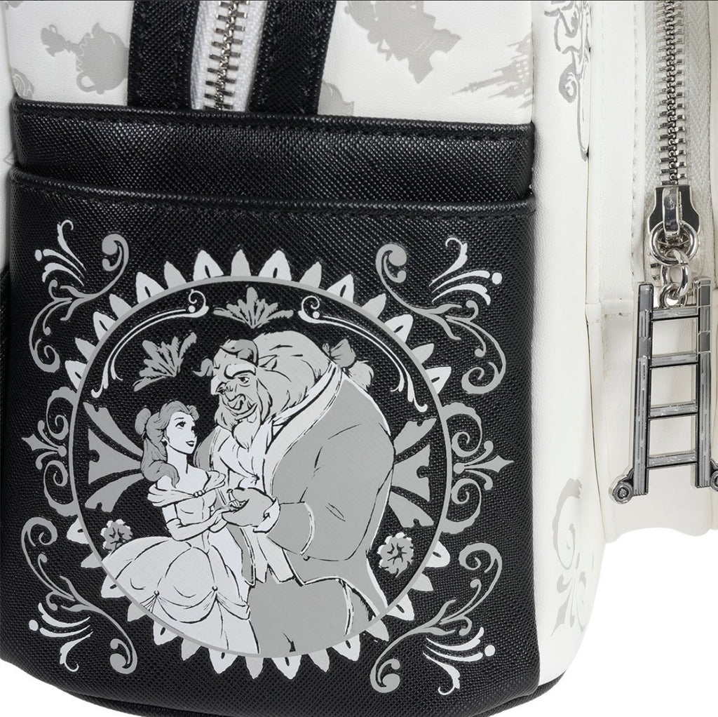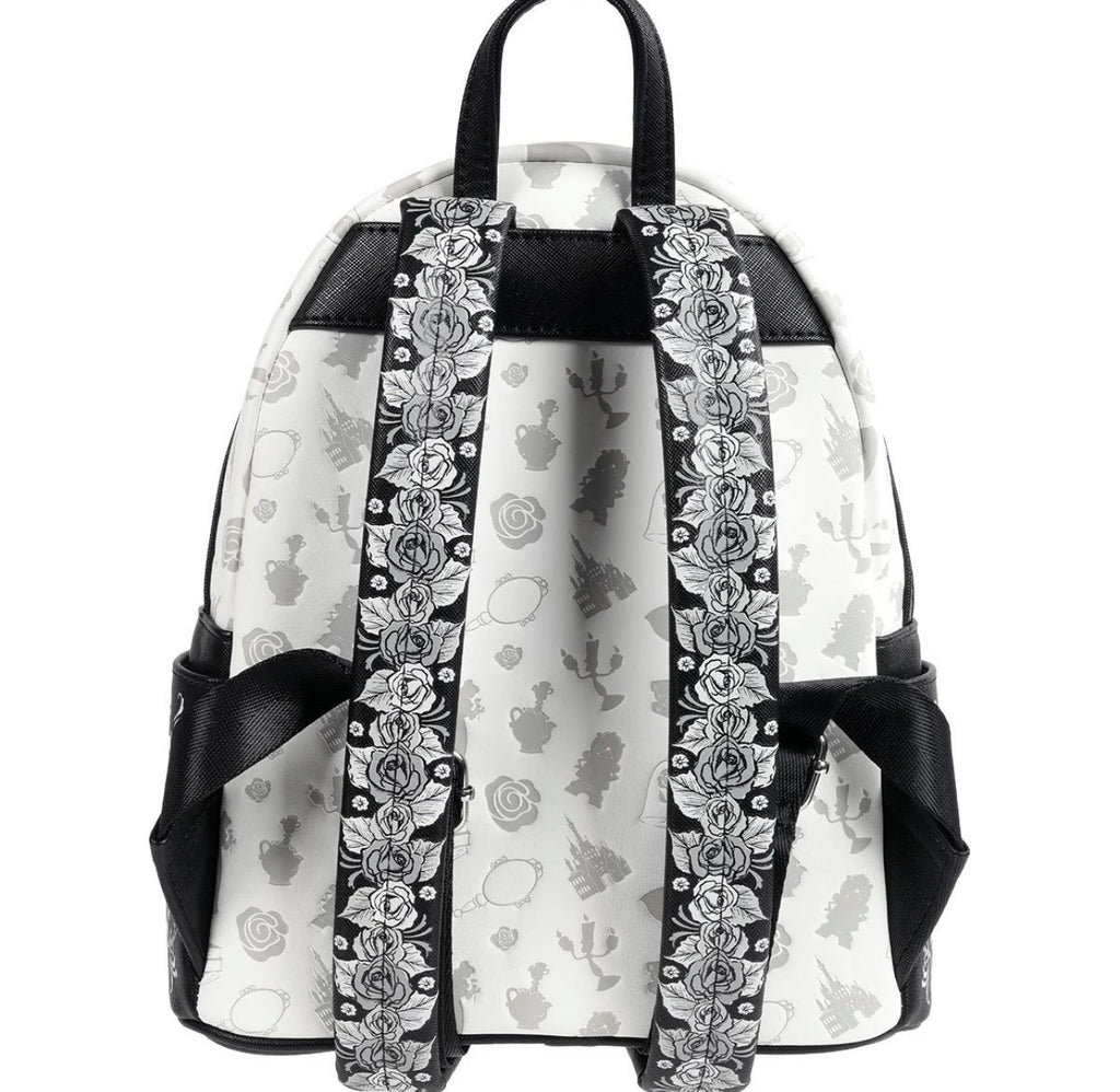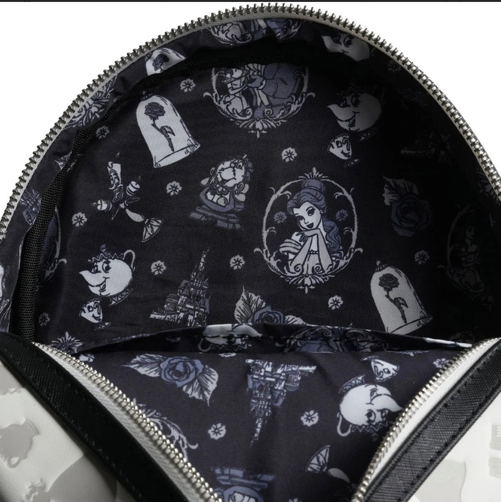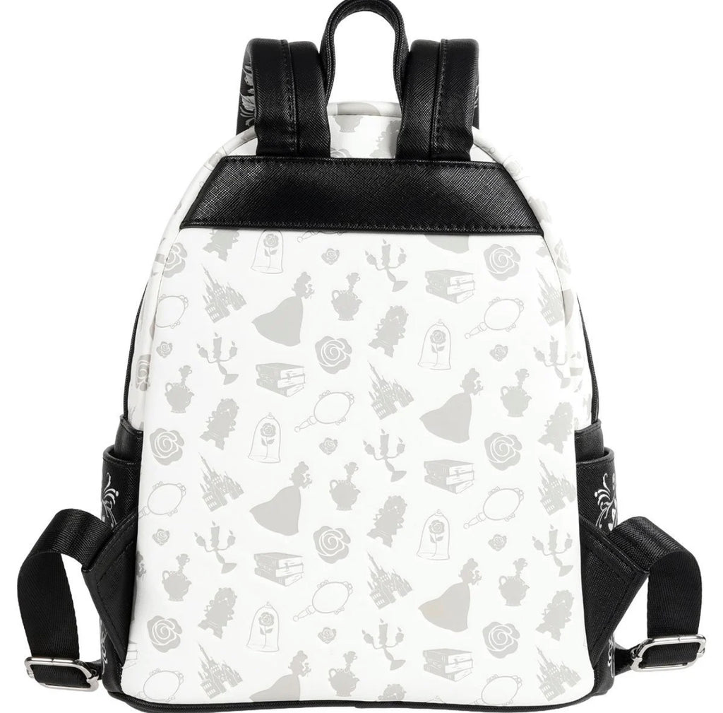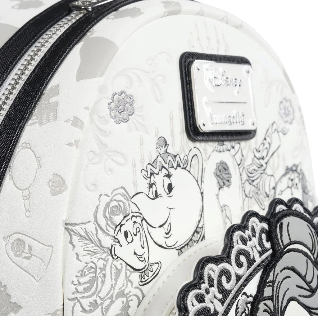 Entertainment Earth Exclusive! Channel your inner Disney Princess with this Beauty and the Beast Belle Sketch Mini-Backpack - Entertainment Earth Exclusive! This mini-backpack features Princess Belle front and center as an applique, surrounded by floral appliques and an elegant embroidered trim. Also featured are some of the residents from the castle: Mrs. Potts, Chip, Lumiere, Cogsworth, and Beast! The entire mini-backpack is debossed with different symbols from the movie and the straps are covered with roses. This faux leather mini-backpack features a sturdy top handle, adjustable shoulder straps, side drop pockets, a front zipper pocket, a metal zipper charm, appliques, debossed, embroidered and printed details with a coordinating interior lining!