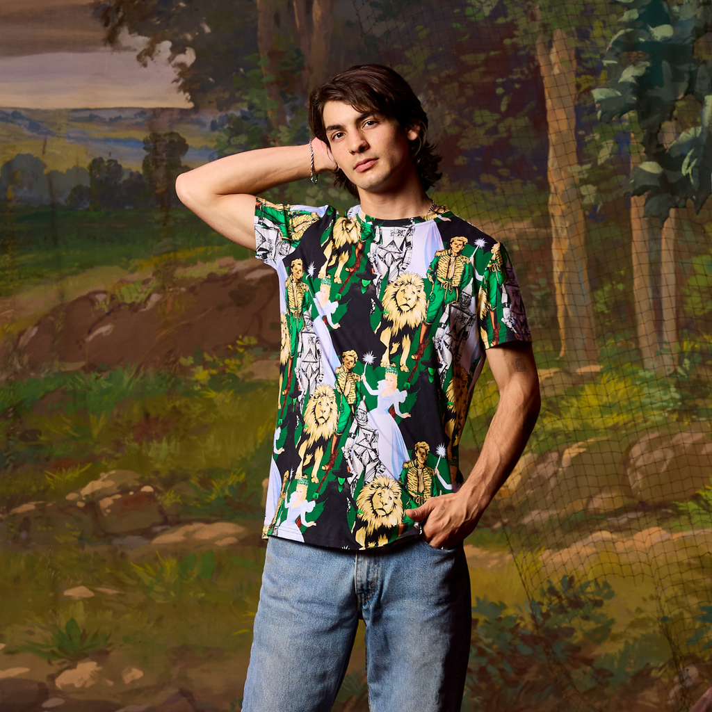 Make a major Ozmopolitan entrance with our Wicked AOP T-Shirt II! Featuring an all-over print of Glinda, Elphaba, Tin Man, Scarecrow, and Cowardly Lion, this is the perfect t-shirt to ugly cry in during Wicked: For Good.